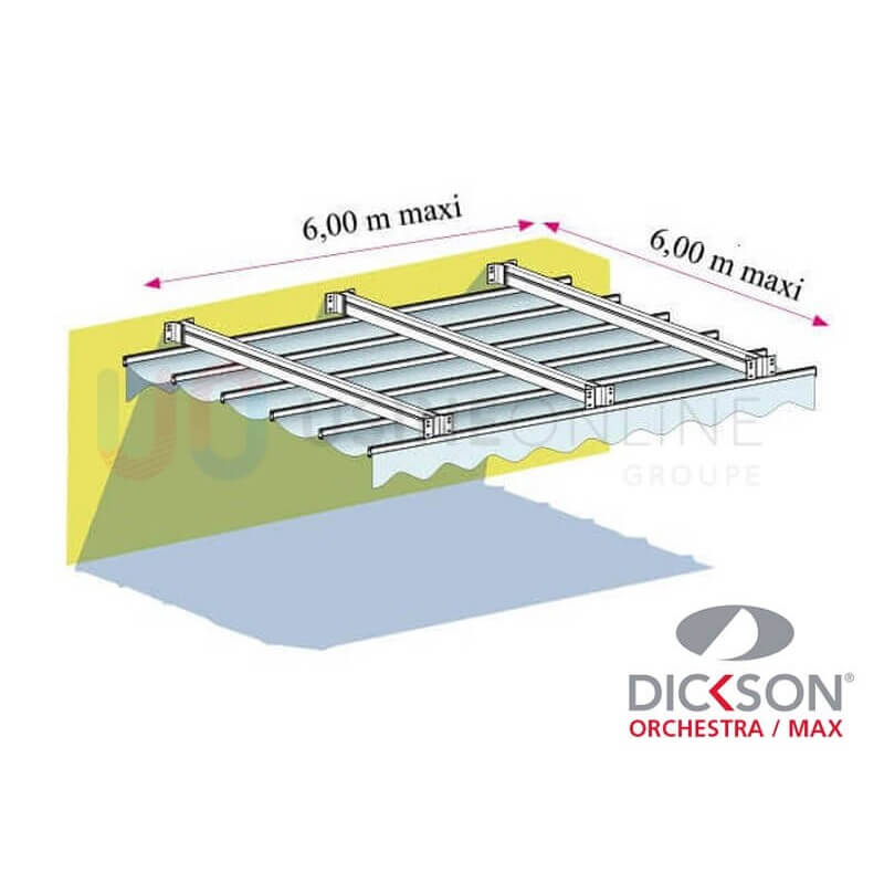 - Toile DICKSON ORCHESTRA MAX : Tissu imperméable à la pluie. Approprié aux stores ouverts en permanence. Fibre acrylique teint masse. Résistance aux UV.