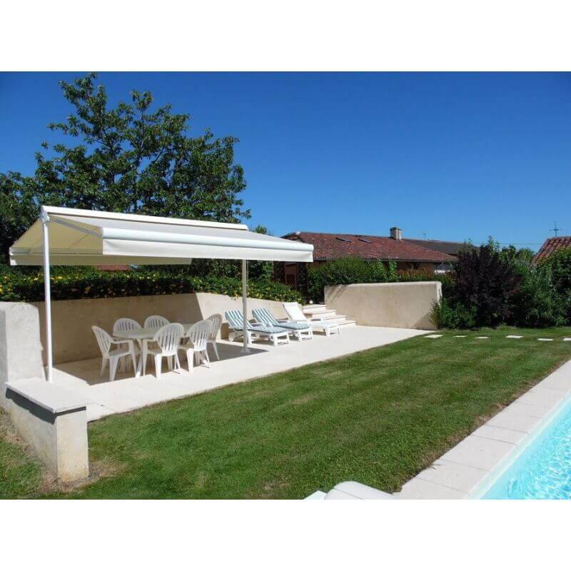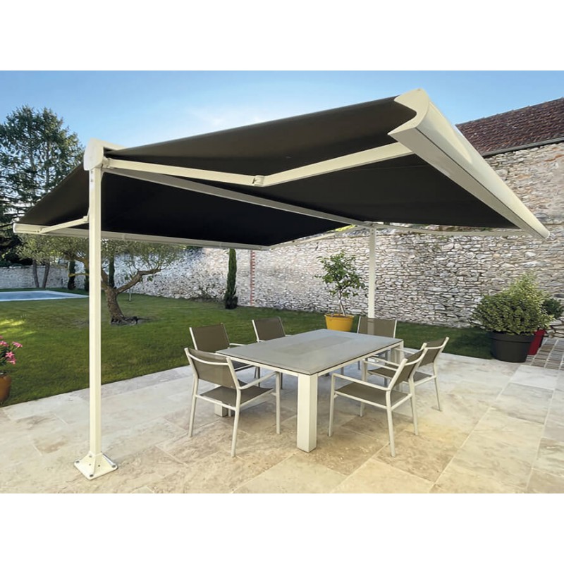 Avec sa structure en aluminium et son design soigné, le store double pente se distingue par sa robustesse et son adaptabilité. Il peut être installé au centre de votre terrasse ou de votre jardin, créant un espace ombragé convivial et accueillant pour les réunions familiales, les repas en plein air ou les moments de détente.