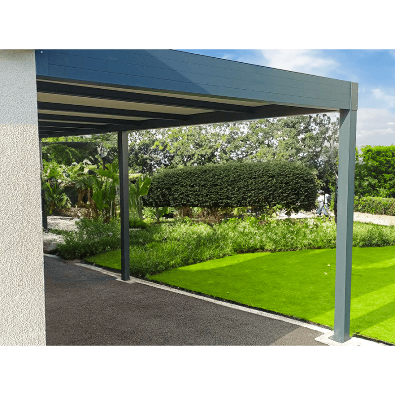 La pergola toit plat panneau sandwich 32mm d'épaisseur d’usine-online est d’une grande robustesse et à une excellente durée de vie pouvant aller jusqu'à 24m47, la structure associe les propriétés d’une pergola aluminium de grande qualité avec une toiture en panneau sandwich isolant de 32mm d'épaisseur avec un traitement anti effet de serre. La pergola toit plat en aluminium d’usine-online vous protège du soleil et des intempéries sous une pergola étanche et elle vous permet de profiter de votre terrasse même lorsque le vent se lève grâce à la structure rigide en aluminium extrudé. Le toit plat avec une inclinaison intégrée à la structure et une descente intégrée aux piliers permettent d’évacuer l’eau facilement en cas de pluie. La pergola toit plat panneau sandwich d’usine-online au toit fixe 0° et aux lignes fines et épurées apportera une note résolument contemporaine à votre extérieur.