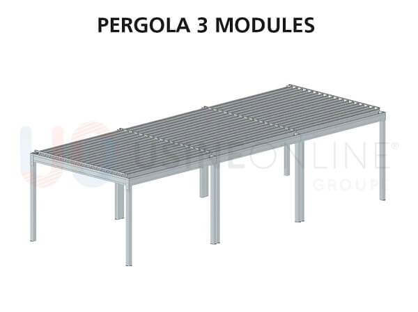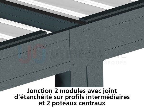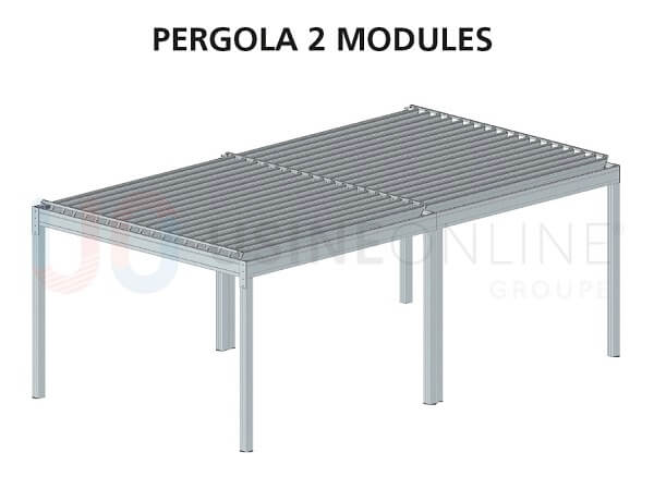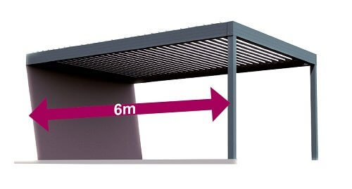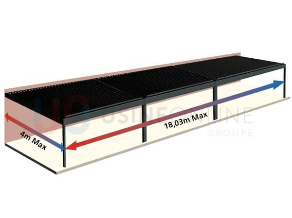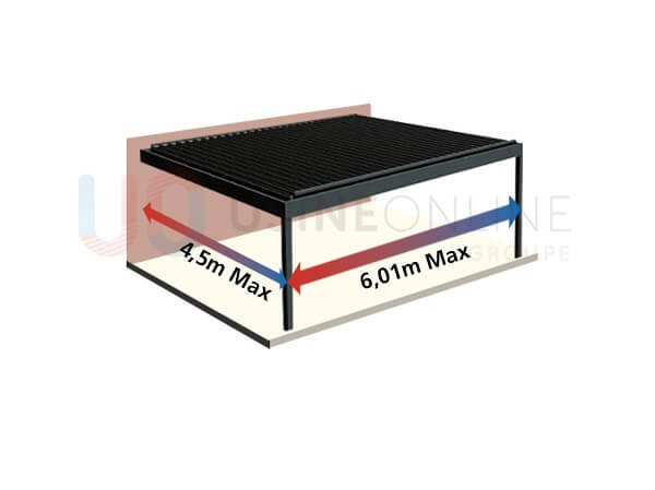 Une pergola sans poteau, c’est aussi possible. Comment ? Il s’agit d’une pergola bioclimatique entre les murs. Pour installer ce type de pergola chez vous, il faut au minimum 3 murs de soutien auxquels sera accrochée la pergola. Ce modèle est aussi disponible pour les pergolas de +25 m2 dans le catalogue en ligne d’Usine Online. La largeur maximale d’un tel module étant de 24 m sur une avancée de 6 m au maximum.