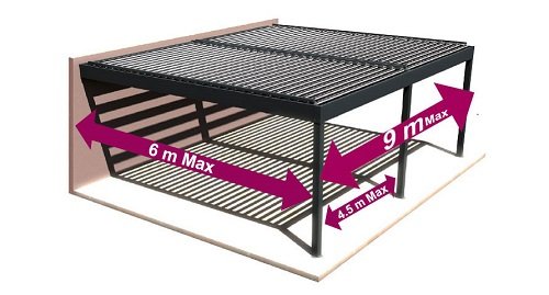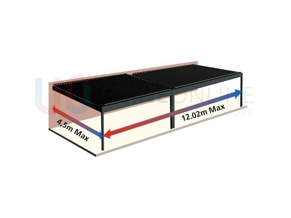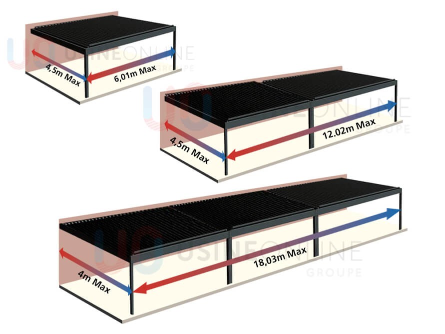 Une pergola adossée, à un module, ne nécessite que 2 poteaux de soutien. L’un des côtés est porté par le mur et l’autre côté est soutenu par les 2 poteaux. Pour choisir cette formule, la pergola doit faire 4,5 m de large maximum pour des lames parallèles et 6,01 m pour de lames perpendiculaires. Cette option vous permet de profiter d’une pergola bioclimatique d’une surface de +25 m2 soutenue seulement par 2 poteaux. Pour celles et ceux à la recherche d’une pergola adossée d’une plus grande taille, il est possible d’installer une pergola jusqu’à 6 m d’avancée et de 25 m pour les plus longues. Les dimensions maximales peuvent varier selon le type de pergola bioclimatique, manuelle ou automatique, adossée ou auto-portée. Il faut donc se renseigner en détail dans la rubrique description du produit sur le site d’Usine Online.