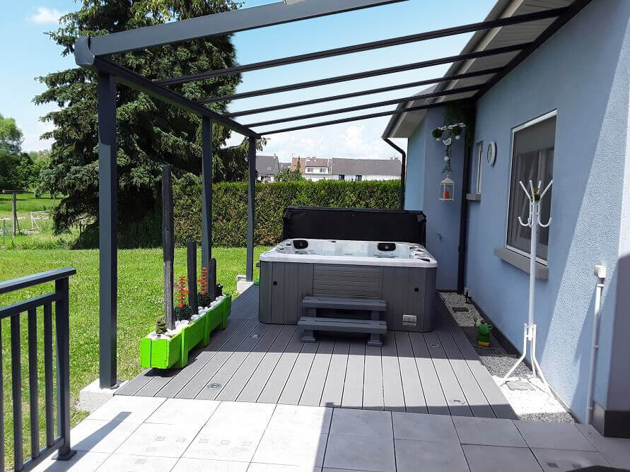 Première possibilité, le toit en panneaux sandwich isolant de 32 mm. Ce matériau est particulièrement apprécié pour ses qualités d’isolant thermique et phonique. Les panneaux isolants ont un coefficient d’isolation équivalent à du triple vitrage. Le revêtement anti-UV participe aussi à réduire la chaleur sous la pergola pendant l’été. Les panneaux offrent une excellente isolation thermique contre la chaleur en été et contre le froiden hiver. L’isolation acoustique permet de continuer vos conversations entre amis. Qu’il pleuve ou qu’il grêle, vous pourrez toujours entendre vos convives à l’autre bout de la table.