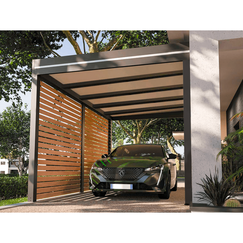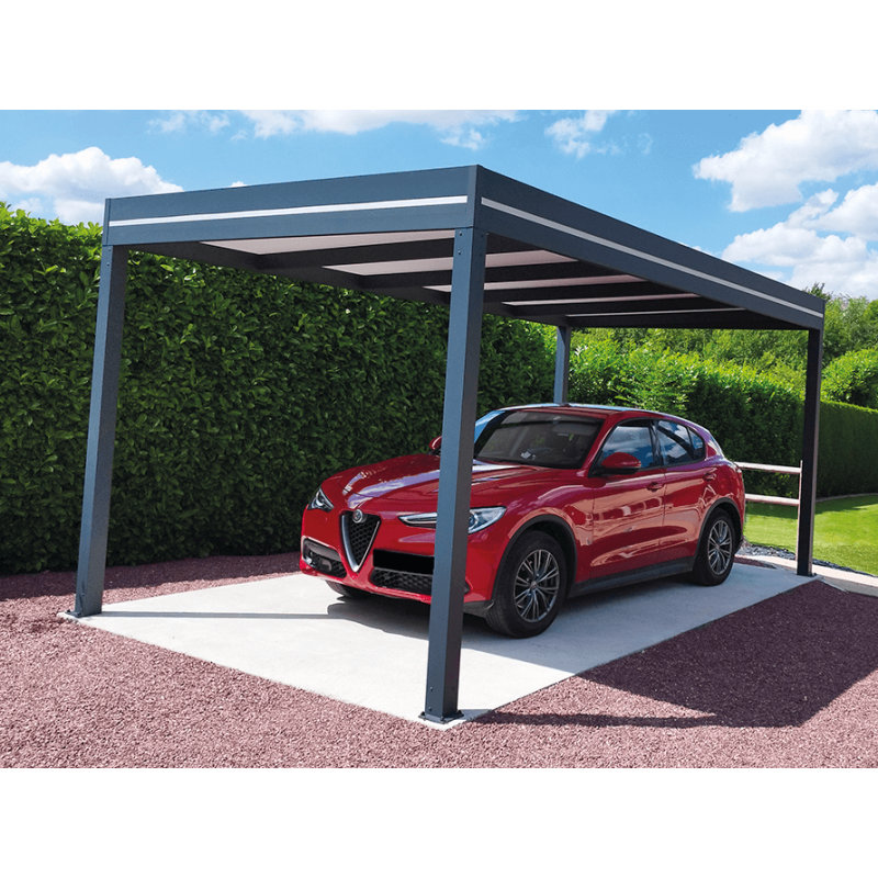 Le carport toit plat autoportant OBX panneaux sandwich 16mm d'épaisseur d’usine-online est d’une grande robustesse et à une excellente durée de vie pouvant aller jusqu'à 12m de large, la structure associe les propriétés d’un carport aluminium de grande qualité avec une toiture en panneau sandwich isolant de 16mm avec un traitement anti effet de serre. Le carport toit plat auto-porté OBX en aluminium d’usine-online vous protège du soleil et des intempéries sous un carport étanche avec sa structure rigide en aluminium extrudé. Le toit plat avec une inclinaison intégrée à la structure et une descente intégrée aux piliers permettent d’évacuer l’eau facilement en cas de pluie. Le carport toit plat auto-porté OBX panneaux sandwich 16mm d'épaisseur d’usine-online au toit fixe 0°, aux lignes fines et épurées avec un bandeau décoratif effet inox brossé apportera une note résolument contemporaine à votre extérieur.