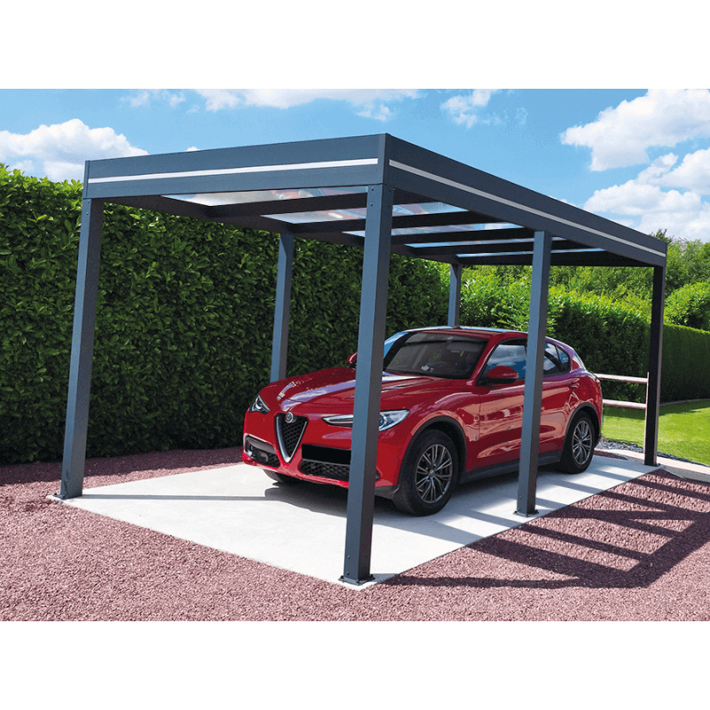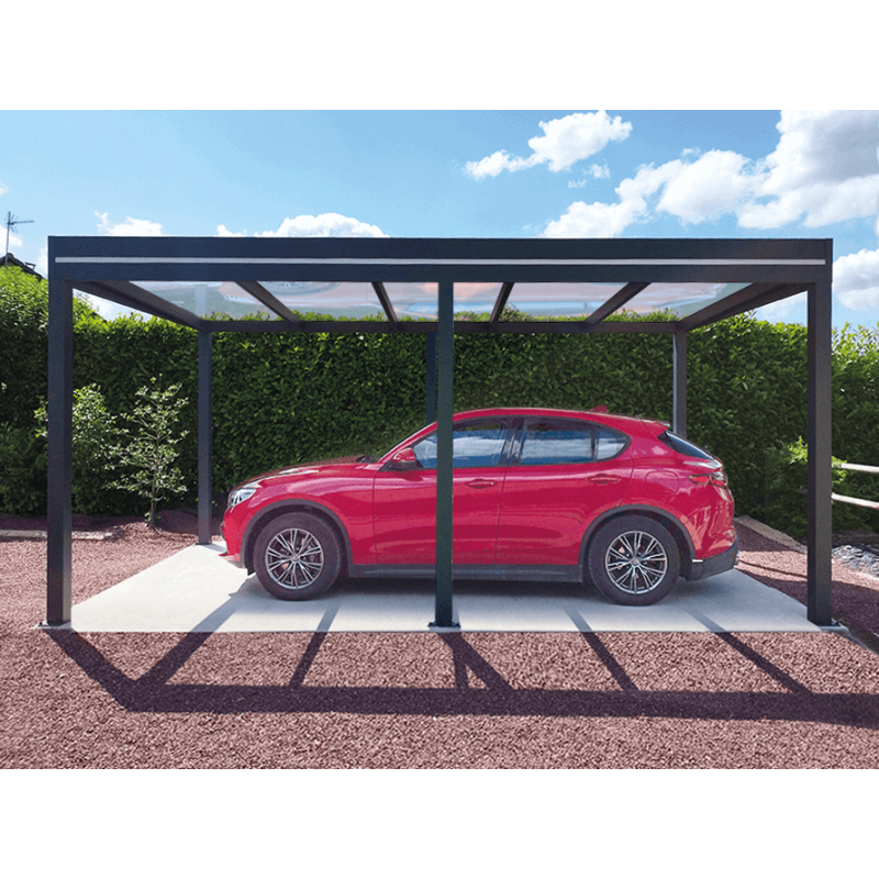 Le carport autoportant OBX toiture vitrage 8mm d'épaisseur d’usine-online est d’une grande robustesse et à une excellente durée de vie pouvant aller jusqu'à 12m de large, la structure associe les propriétés d’un carport aluminium de grande qualité avec une toiture avec vitrage non ouvrant avec un traitement anti-UV. Le carport toit plat auto-porté OBX en aluminium d’usine-online protège votre véhicule des intempéries sous un carport étanche avec sa structure rigide en aluminium extrudé. Le toit plat avec une inclinaison intégrée à la structure et une descente intégrée aux piliers permettent d’évacuer l’eau facilement en cas de pluie. Le carport toit plat auto-porté OBX toiture vitrée non ouvrante d’usine-online au toit fixe 0°, aux lignes fines et épurées avec un bandeau décoratif effet inox brossé apportera une note résolument contemporaine à votre extérieur.
