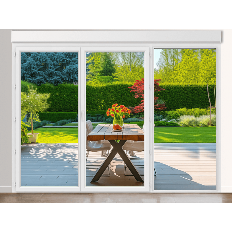 Comme l'isolation thermique pour les fenêtres devient de plus en plus importante de nos jours, vous pouvez configurer votre porte-fenêtre pvc 3 vantaux (2 ouvrants + 1 fixe à droite) avec volet roulant intégré avec un vitrage de base 4/20/4 ARGON isolant qui évite les ponts thermiques.