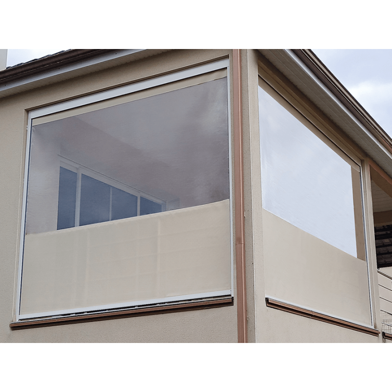 Le panoramique de hauteur 1,30 m est moins cher que le tout cristal et n’est pas limité en dimension ! Un soubassement est nécessaire car le cristal dans le bas du store s’abîme avec les pieds qui tapent dedans, les tables et chaises qui frottent… C’est ce qui se dégrade le plus vite et qui peut s’éviter avec un soubassement de 500 à 800 mm (hauteur table) qui laisse la vision panoramique. La toile micro-perforée périphérique rattrape les efforts si l’endroit exposé au vent (classe 3 jusqu’à 12m²). Si le store est resté enroulé pendant tout l’hiver, lors du déroulement le film peut présenter des effets de vagues.
