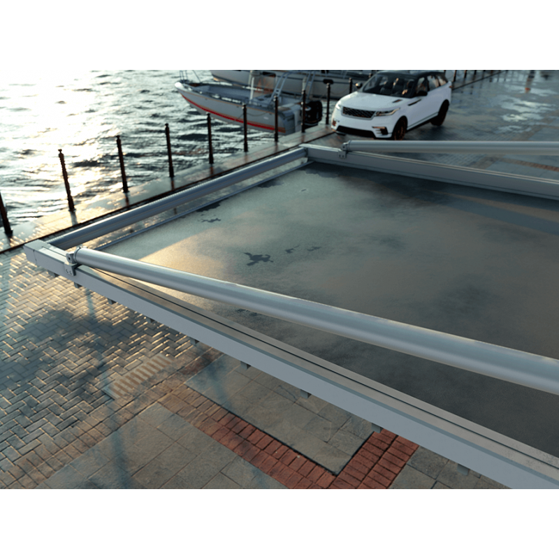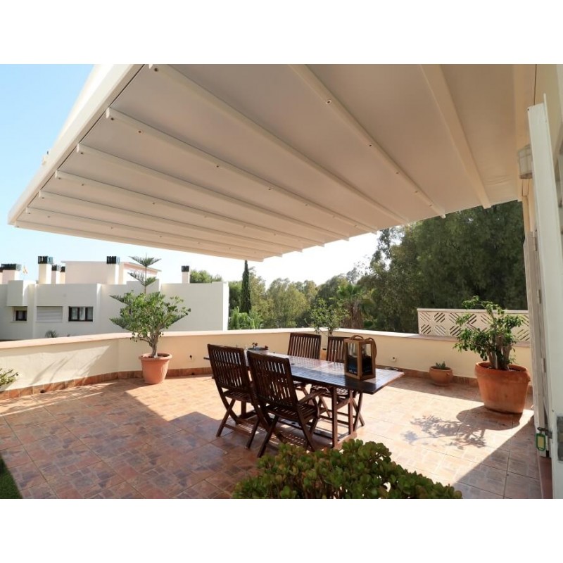 Le matériau utilisé pour l’armature de la pergola toile rétractable S-Luxe Sauleda Technal USINE-ONLINE est en aluminium, ce dernier est extrudé entre 1.5 mm et 2.3 mm d’épaisseur selon les profilés et reçoit un traitement spécial bord de mer avant le thermolaquage.