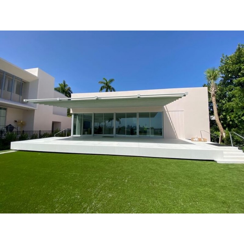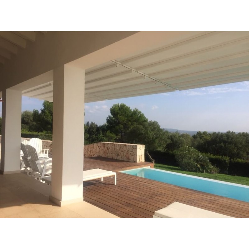 La toile Soltis Proof W96 Ferrari de la pergola toile rétractable S-Luxe suspendue (sans poteaux) assure un compromis idéal entre confort visuel et confort thermique, elle garantit une excellente visibilité vers l'extérieur. Résistance garantie aux Uvs ainsi qu'aux intempéries et 100% recyclable. La toile Ferrari® Soltis W96 Micro-Perforée Étanche de 620gr/m² permet de couvrir des structures polyvalentes et légères qui combinent intérieur et extérieur avec un maximum d'élégance. La toile Ferrari® Soltis W96 Micro-Perforée Étanche est la solution parfaite dans le cadre d’une pergola à toile tendue : 100% étanche et micro-perforée, sa toile micro-perforée garantit à tout moment un aspect légèrement transparent, étanche et lutte efficacement contre la chaleur en l’évacuant par ses micro-perforations. La toile stoppe jusqu’à 95% des UVA et des UVB, la toile Ferrari® Soltis W96 Micro-Perforée Étanche de la pergola toile rétractable S-Luxe suspendue (bras de supports) assure un grand confort visuel car elle filtre la lumière sans la bloquer et protège de l’éblouissement.