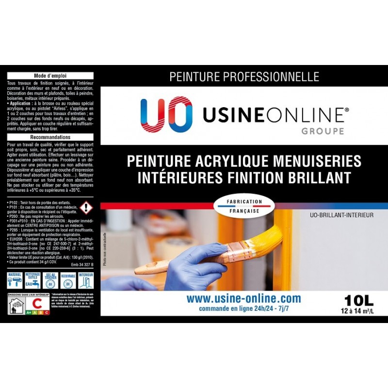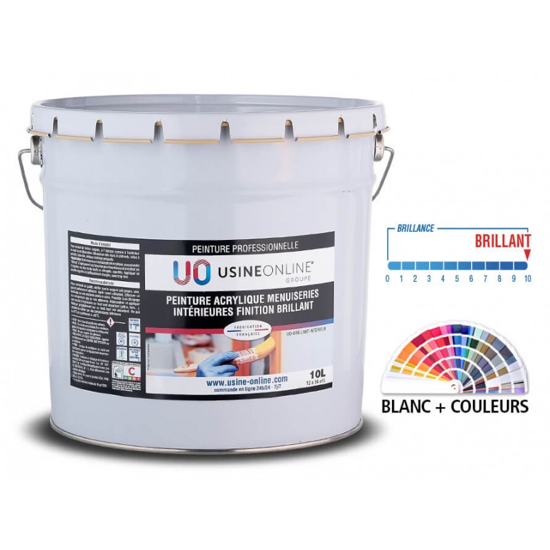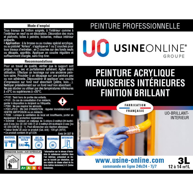 UO-BRILLANT-INTERIEUR d'USINE-ONLINE est une peinture acrylique en phase aqueuse, prête à l'emploi, d'aspect brillant.