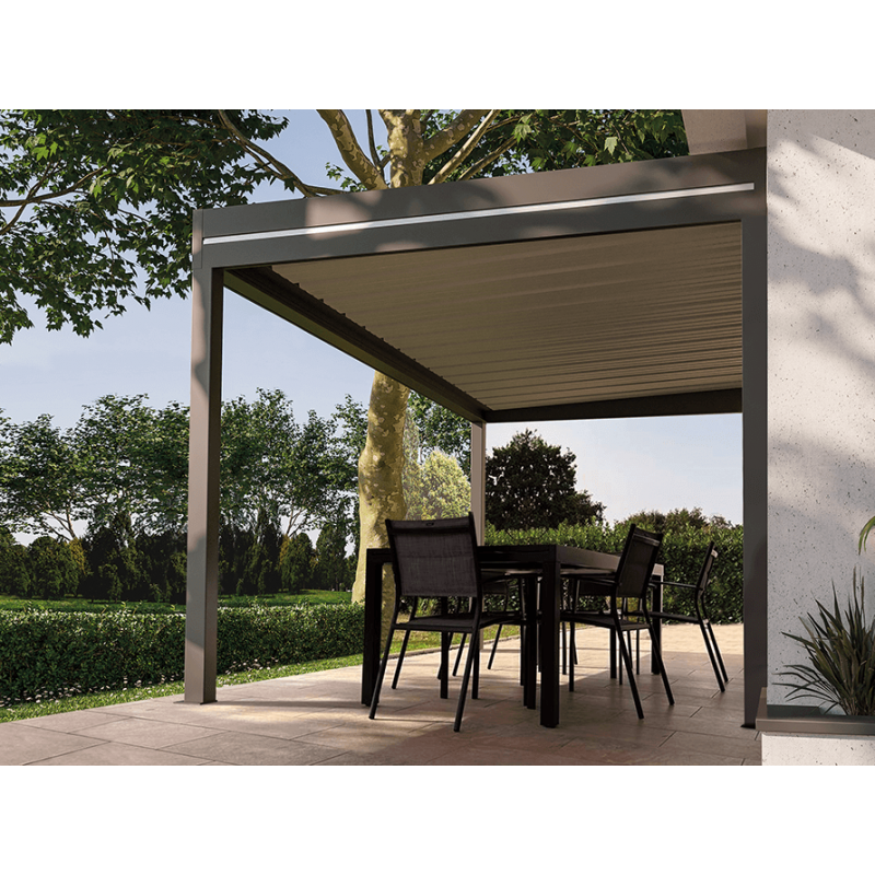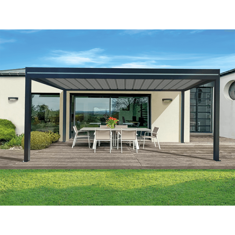 La pergola toit plat autoportante OBX bac acier d’usine-online est d’une grande robustesse et à une excellente durée de vie pouvant aller jusqu'à 5.81m, la structure associe les propriétés d’une pergola aluminium de grande qualité avec une toiture en bac acier avec un traitement anti-condensation. La pergola toit plat autoportante OBX en aluminium d’usine-online vous protège du soleil et des intempéries sous une pergola étanche et elle vous permet de profiter de votre terrasse même lorsque le vent se lève grâce à la structure rigide en aluminium extrudé. Le toit plat avec une inclinaison intégrée à la structure et une descente intégrée aux piliers permettent d’évacuer l’eau facilement en cas de pluie. La pergola toit plat auto-portée OBX bac acier d’usine-online au toit fixe 0°, aux lignes fines et épurées avec un bandeau décoratif effet inox brossé apportera une note résolument contemporaine à votre extérieur.