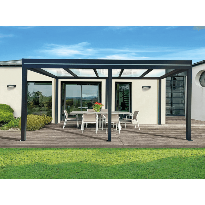 La pergola autoportante OBX toit vitré 8mm d'épaisseur (44.2) d’usine-online est d’une grande robustesse et à une excellente durée de vie pouvant aller jusqu'à 12m de large, la structure associe les propriétés d’une pergola aluminium de grande qualité avec une toiture en vitrage feuilleté avec un traitement anti-UV. La pergola toit plat auto-portée OBX en aluminium d’usine-online vous protège des intempéries sous une pergola étanche et elle vous permet de profiter de votre terrasse même lorsque le vent se lève grâce à la structure rigide en aluminium extrudé. Le toit plat avec une inclinaison intégrée à la structure et une descente intégrée aux piliers permettent d’évacuer l’eau facilement en cas de pluie. La pergola toit plat auto-portée OBX toit vitré transparent ou opale d’usine-online au toit fixe 0°, aux lignes fines et épurées avec un bandeau décoratif effet inox brossé apportera une note résolument contemporaine à votre extérieur.
