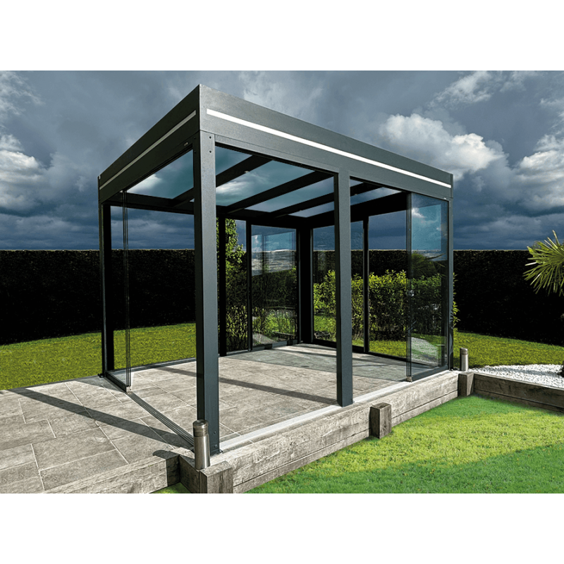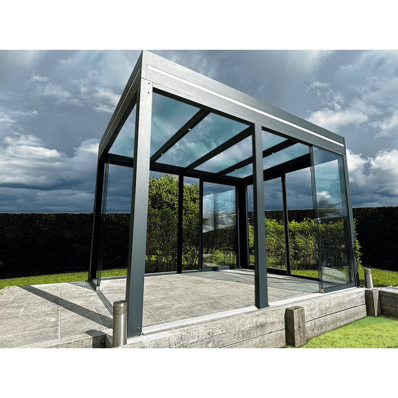 Configurez et Commandez votre Pergola Aluminium Toit Plat en Verre Feuilleté (Transparent ou Opale) OBX Autoportée Sur Mesure *Étape obligatoire