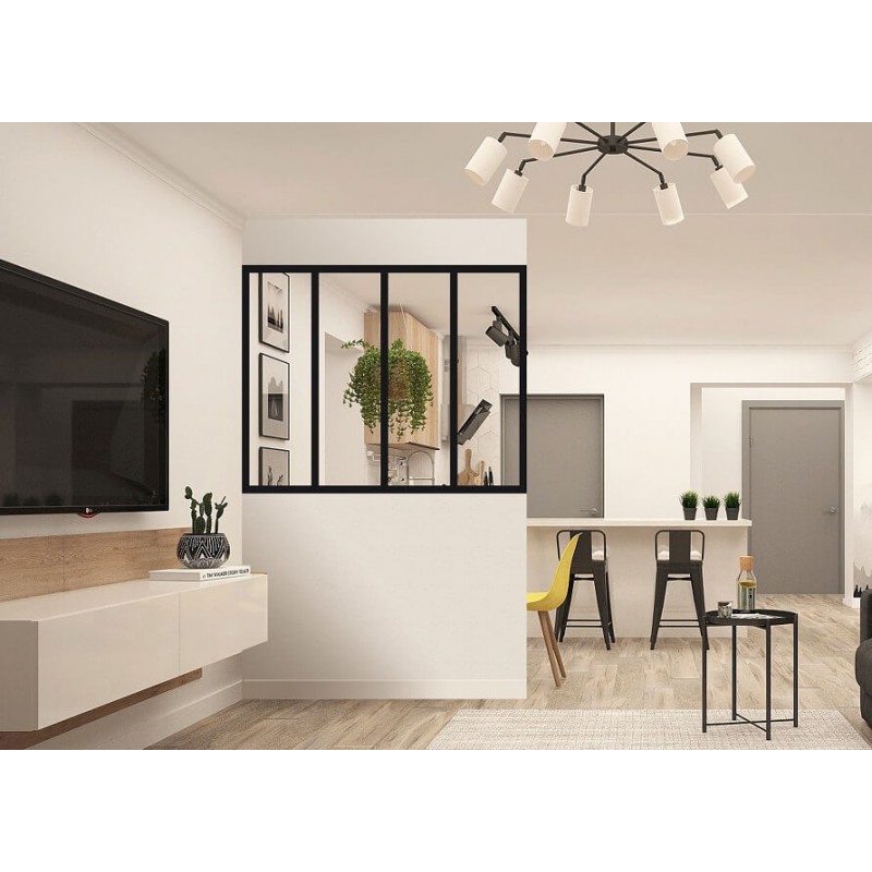 Destinée à un usage intérieur, la verrière aluminium 4 vitrages transparents Usine-Online est idéale pour cloisonner ou séparer partiellement les espaces de votre logement. La verrière aluminium 4 vitrages transparents est proposée en prix de base avec un thermolaquage noir 9005, gris anthracite 7016 ou blanc 9016 finition sablée avec un verre "Sécurit" de 6 mm, d'autres choix de coloris et de vitrages s'offrent à vous pour répondre aux tendances de décoration actuelles. L'installation de votre verrière aluminium 4 vitrages transparents s'effectuera en "tunnel" (entre murs) et est très facile d'installation car elle est livrée déjà assemblée en usine ce qui vous fera gagner +/- 2 h sur le temps de pose, la visserie murale vous sera livrée dans le colis.