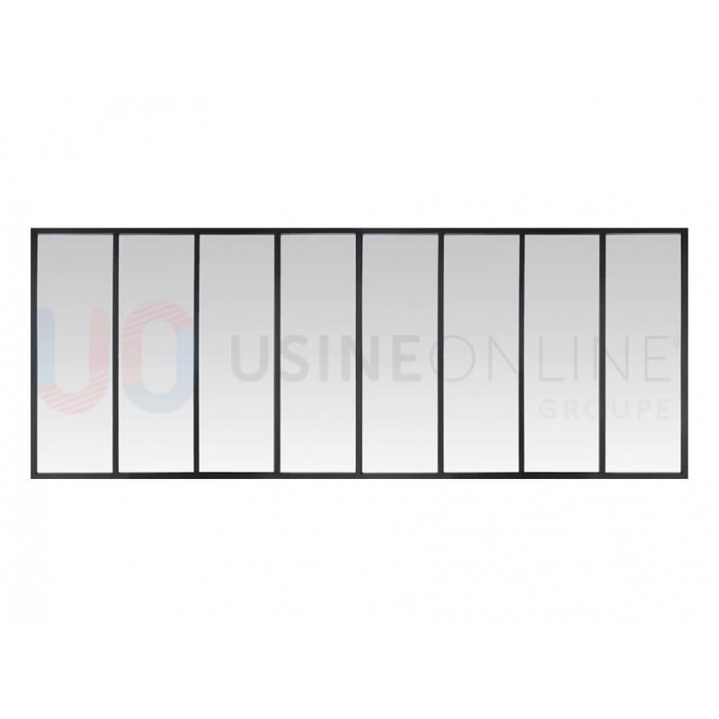 Destinée à un usage intérieur, la verrière aluminium 8 vitrages transparents Usine-Online est idéale pour cloisonner ou séparer partiellement les espaces de votre logement. La verrière aluminium 8 vitrages transparents est proposée de base en thermolaquage noir 9005 finition sablée avec un verre "Sécurit" de 6 mm, d'autres choix de coloris et de vitrages s'offrent à vous pour répondre aux tendances de décoration actuelles. L'installation de votre verrière aluminium 8 vitrages transparents s'effectuera en "tunnel" (entre murs) et est très facile d'installation car elle est livrée déjà assemblée en usine ce qui vous fera gagner +/- 2 h sur le temps de pose, la visserie murale vous sera livrée dans le colis.